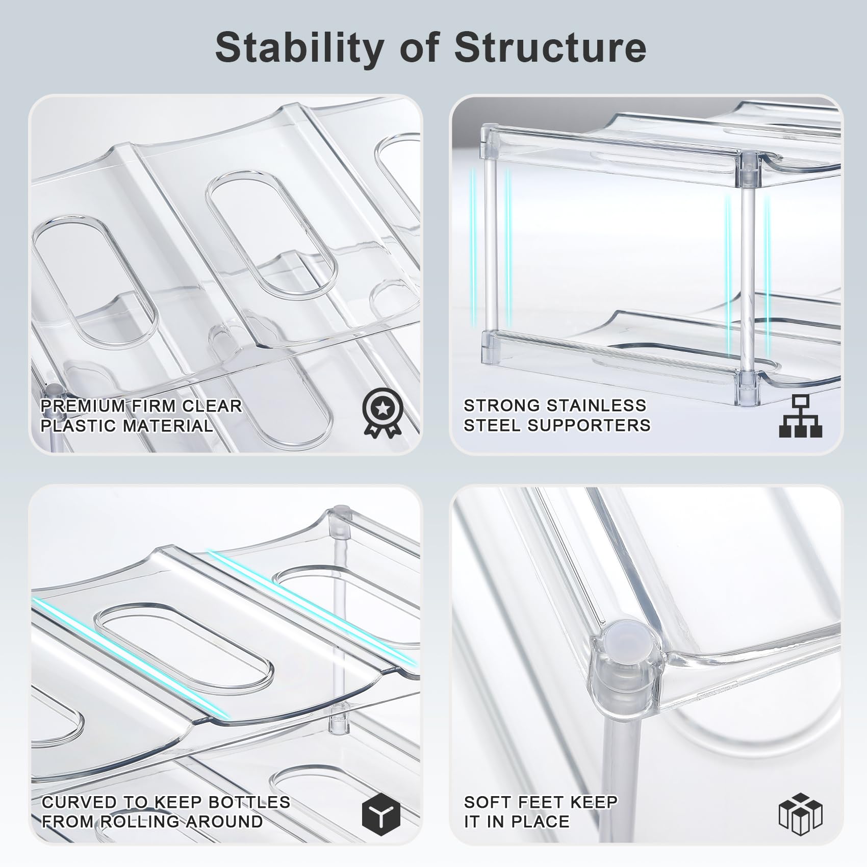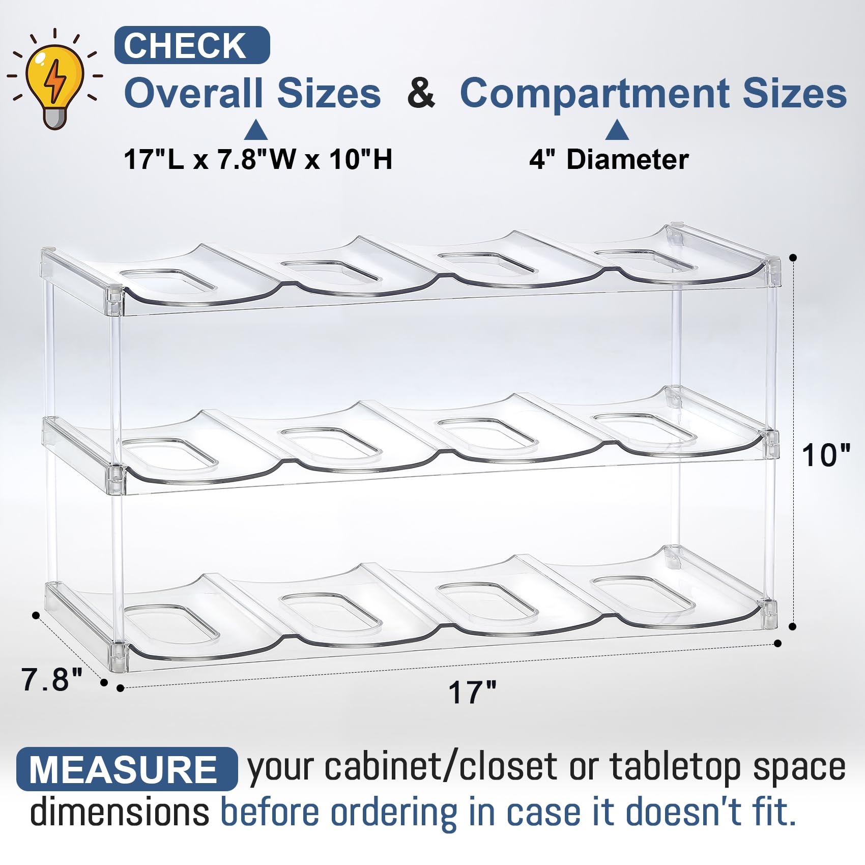 - ★High Quality Clear Material and Solid Construction - Each shelf is made of thick clear plastic. Each tier is tightly connected by 4 sturdy solid posts. The 3 tier water bottle holder can hold up to 30 lbs each tier without wobble or crack. (Note: not dishwaher safe)