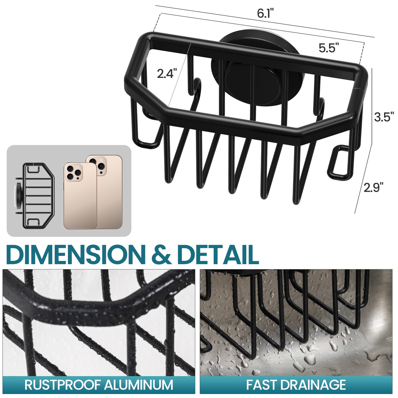 - [Rustproof & Fast Draining, Keep tidy]: Measures 6.1" x 2.9" x 3.5" and creat sink storage in compact spaces. Made of aluminum finished in rustproof coating which not only prevents rust but also stands up to times. With all-around drainage design, the sponge caddy has maximum air ventilation and fully dripes water away. Holds Sponge, Scrubber, Scouring Pad, Drain Stopper, And More! Keep your kitchen tools air dry quickly and clean