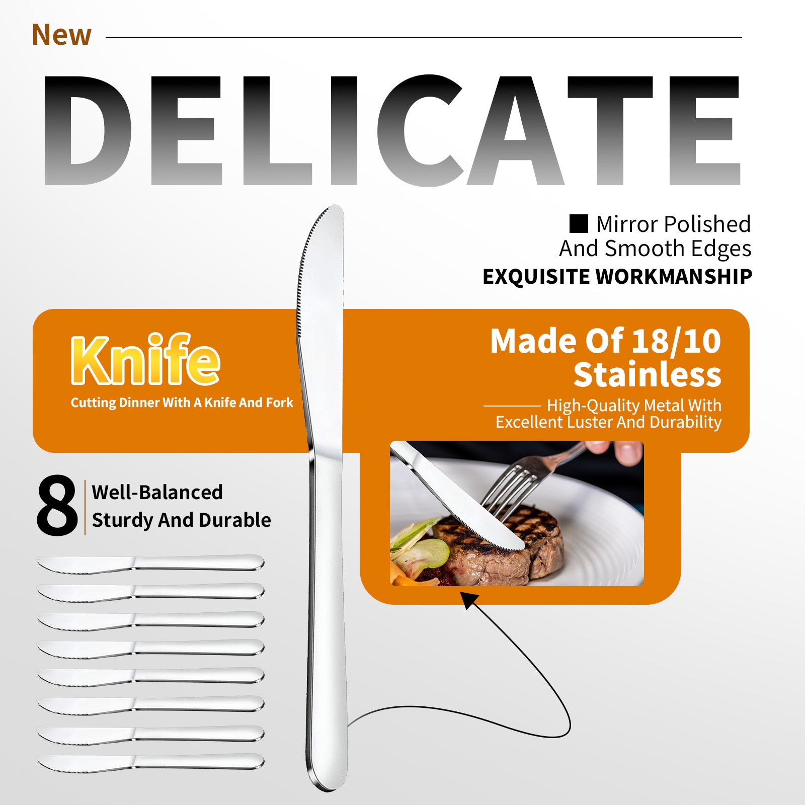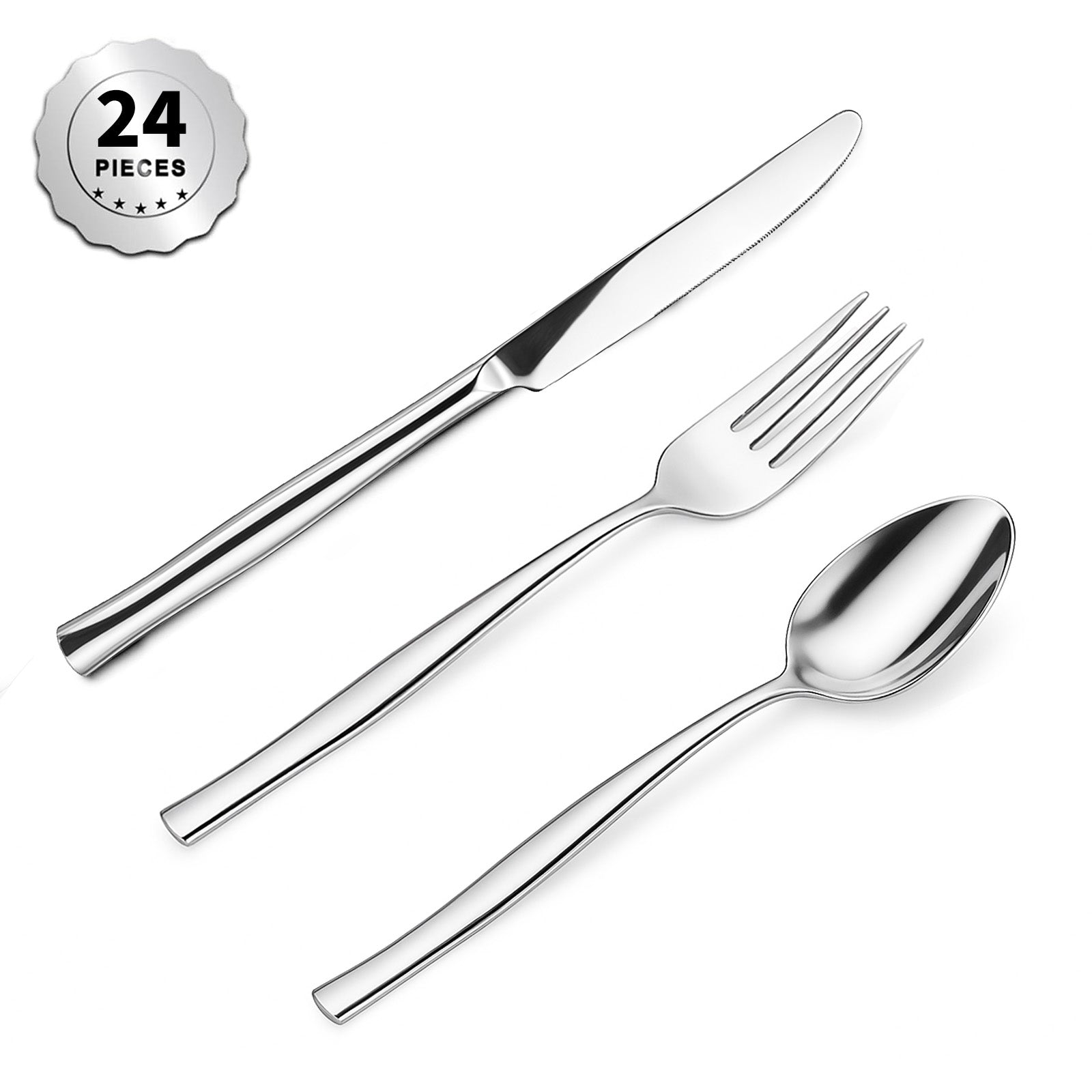 - 24-Pcs Silverware Set contains: 8 Dinner Knives, 8 Dinner Forks, 8 Dinner Spoons. Service It will be the great choice for family dinners, restaurants, picnics, BBQ, wedding, and so on.