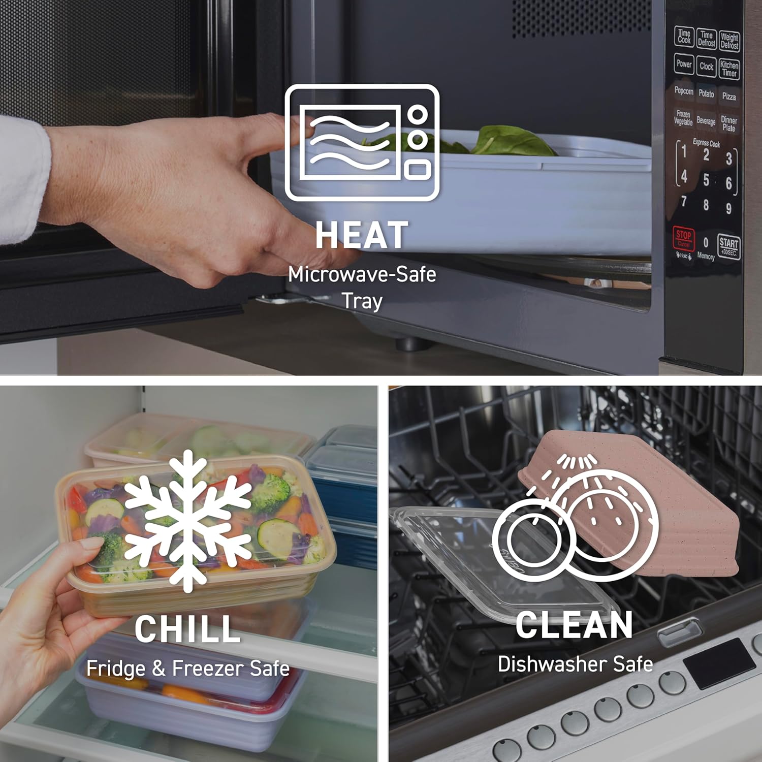 - Microwave, Freezer & Dishwasher Safe: Easy to heat, store, and clean! Safely reheat food from fridge or freezer—microwave trays only. Top-shelf dishwasher safe for hassle-free cleanup; hand-wash lids for best results.